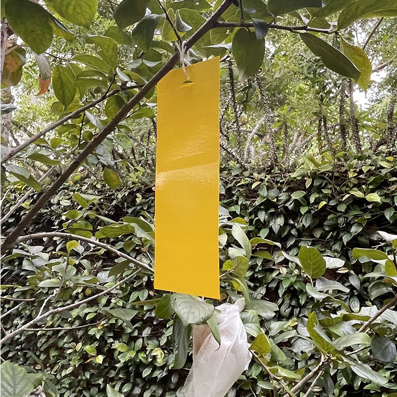 Logo que em contato com o adesivo da placa, o inseto fica preso e morre.