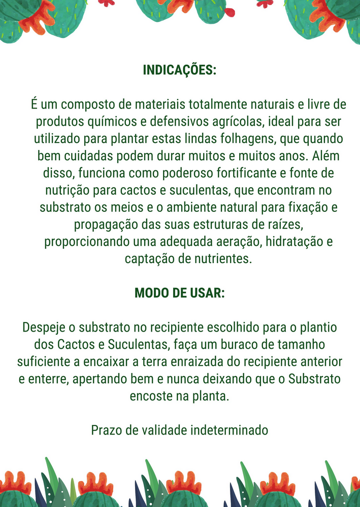 Use para plantar todos os tipos de cactos e suculentas cultivadas em vasos ou em canteiros ou terrários.